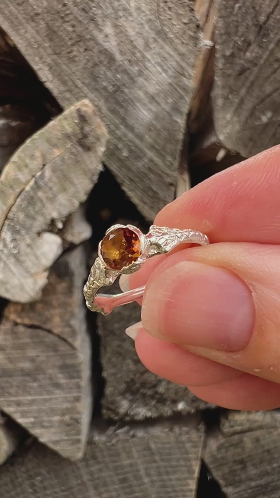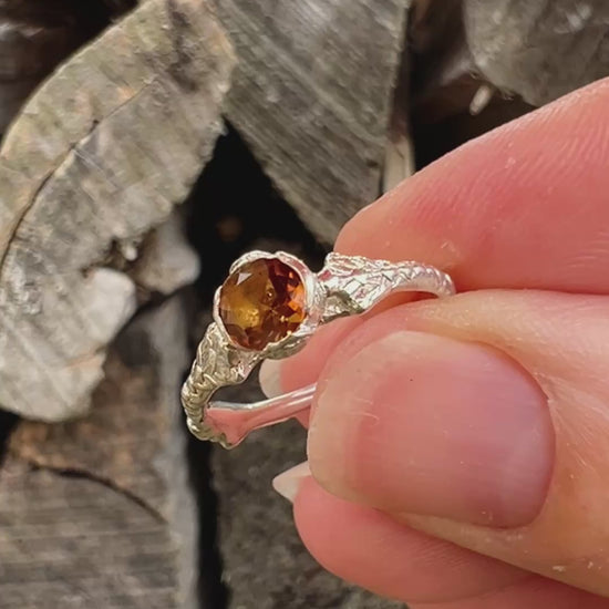 A slender cedar branch forms the elegant band of this ring, arching gently upward where the shoulders meet the central gemstone setting. The setting itself is cast from a cedar cone, creating a distinctive natural silhouette that is both rustic and refined.
