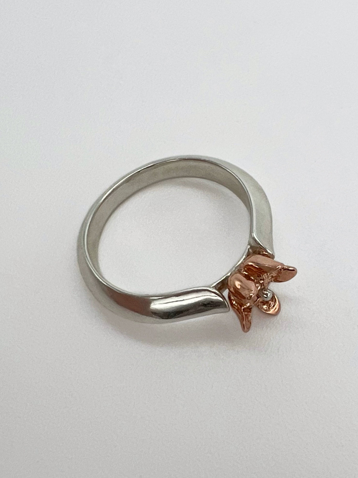 This handcrafted ring features a milkweed flower cast in solid 14K pink gold, molded from a real bloom in my native garden to preserve the intricate shapes of its form. The sterling silver band is hand-carved with a flowing silhouette, its subtle knife-edge tapering and curving to form a leaf shape that rises to meet the flower. The inside of the band is gently curved for a comfort fit, making this ring as easy to wear as it is beautiful.